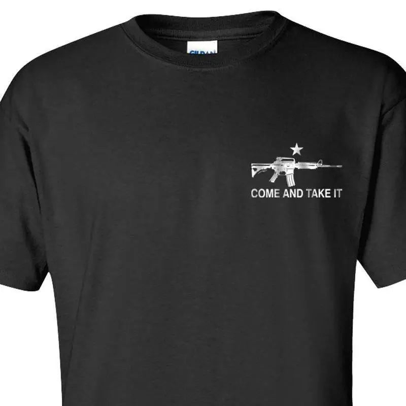 Introducing the Black Assault Rifle Come and Take It T-Shirt, a unique blend of style and statement. This shirt is not just a piece of clothing; it’s a declaration of your support for Second Amendment rights. Each tee is professionally screen-printed, ensuring a high-quality finish that stands out.